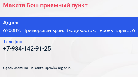 Макита-Бош, приемный пункт по адресу 690089, Приморский край, Владивосток, Героев Варяга, 6 в дальнейшем Организация, размещена в следующих категориях: