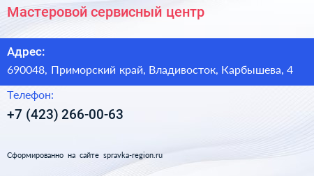Мастеровой, сервисный центр по адресу 690048, Приморский край, Владивосток, Карбышева, 4 в дальнейшем Организация, размещена в следующих категориях: