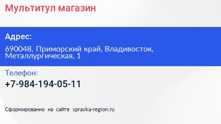 Мультитул, магазин по адресу 690048, Приморский край, Владивосток, Металлургическая, 1 в дальнейшем Организация, размещена в следующих категориях:
