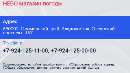 НЕБО, магазин погоды по адресу 690002, Приморский край, Владивосток, Океанский проспект, 157 в дальнейшем Организация, размещена в следующих категориях: