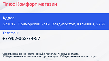 Плюс Комфорт, магазин по адресу 690012, Приморский край, Владивосток, Калинина, 275Б в дальнейшем Организация, размещена в следующих категориях:
