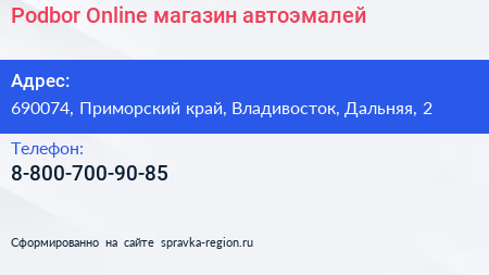 Podbor.Online, магазин автоэмалей по адресу 690074, Приморский край, Владивосток, Дальняя, 2 в дальнейшем Организация, размещена в следующих категориях: