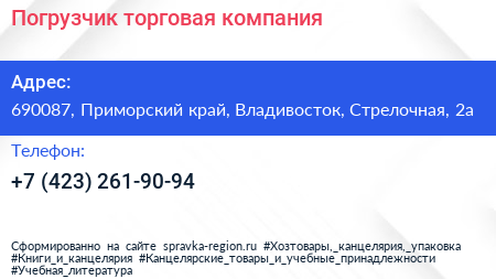 Погрузчик, торговая компания по адресу 690087, Приморский край, Владивосток, Стрелочная, 2а в дальнейшем Организация, размещена в следующих категориях: