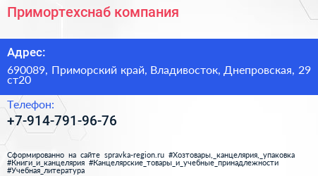Примортехснаб, компания по адресу 690089, Приморский край, Владивосток, Днепровская, 29 ст20 в дальнейшем Организация, размещена в следующих категориях: