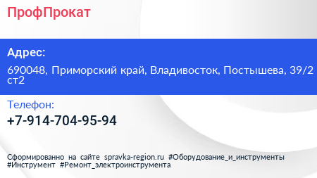 ПрофПрокат по адресу 690048, Приморский край, Владивосток, Постышева, 39/2 ст2 в дальнейшем Организация, размещена в следующих категориях: