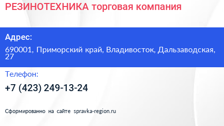 РЕЗИНОТЕХНИКА, торговая компания по адресу 690001, Приморский край, Владивосток, Дальзаводская, 27 в дальнейшем Организация, размещена в следующих категориях: