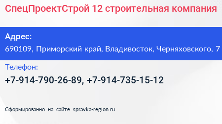 СпецПроектСтрой-12, строительная компания по адресу 690109, Приморский край, Владивосток, Черняховского, 7 в дальнейшем Организация, размещена в следующих категориях: