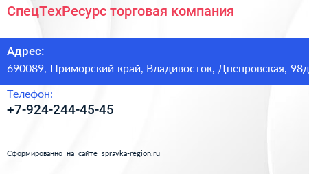 СпецТехРесурс, торговая компания по адресу 690089, Приморский край, Владивосток, Днепровская, 98д в дальнейшем Организация, размещена в следующих категориях: