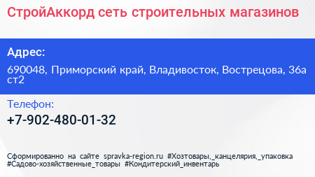 СтройАккорд, сеть строительных магазинов по адресу 690048, Приморский край, Владивосток, Вострецова, 36а ст2 в дальнейшем Организация, размещена в следующих категориях: