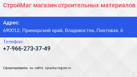 СтройМаг, магазин строительных материалов по адресу 690012, Приморский край, Владивосток, Пихтовая, 6 в дальнейшем Организация, размещена в следующих категориях: