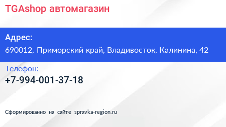 TGAshop, автомагазин по адресу 690012, Приморский край, Владивосток, Калинина, 42 в дальнейшем Организация, размещена в следующих категориях: