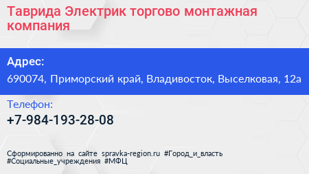 Таврида Электрик, торгово-монтажная компания по адресу 690074, Приморский край, Владивосток, Выселковая, 12а в дальнейшем Организация, размещена в следующих категориях: