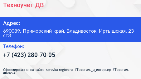 Техноучет ДВ по адресу 690089, Приморский край, Владивосток, Иртышская, 23 ст3 в дальнейшем Организация, размещена в следующих категориях: