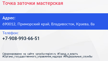 Точка заточки, мастерская по адресу 690012, Приморский край, Владивосток, Краева, 8а в дальнейшем Организация, размещена в следующих категориях: