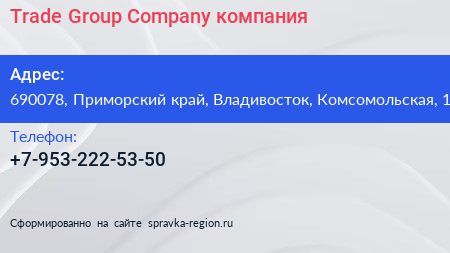 Trade Group Company, компания по адресу 690078, Приморский край, Владивосток, Комсомольская, 1 в дальнейшем Организация, размещена в следующих категориях: