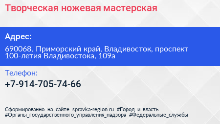 Творческая ножевая мастерская по адресу 690068, Приморский край, Владивосток, проспект 100-летия Владивостока, 109а в дальнейшем Организация, размещена в следующих категориях: