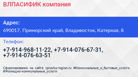 ВЛПАСИФИК, компания по адресу 690017, Приморский край, Владивосток, Катерная, 8 в дальнейшем Организация, размещена в следующих категориях: