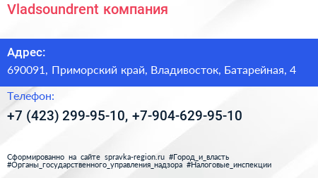 Vladsoundrent, компания по адресу 690091, Приморский край, Владивосток, Батарейная, 4 в дальнейшем Организация, размещена в следующих категориях: