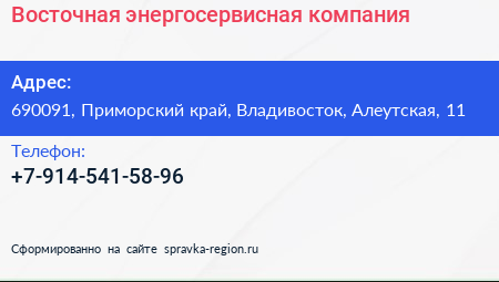 Восточная энергосервисная компания по адресу 690091, Приморский край, Владивосток, Алеутская, 11 в дальнейшем Организация, размещена в следующих категориях: