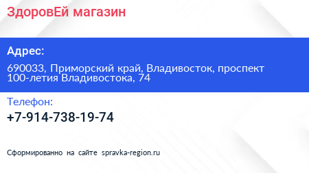 ЗдоровЕй, магазин по адресу 690033, Приморский край, Владивосток, проспект 100-летия Владивостока, 74 в дальнейшем Организация, размещена в следующих категориях: