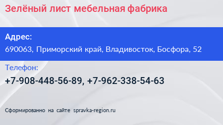 Зелёный лист, мебельная фабрика по адресу 690063, Приморский край, Владивосток, Босфора, 52 в дальнейшем Организация, размещена в следующих категориях: