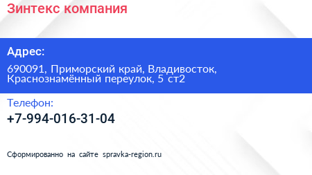 Зинтекс, компания по адресу 690091, Приморский край, Владивосток, Краснознамённый переулок, 5 ст2 в дальнейшем Организация, размещена в следующих категориях: