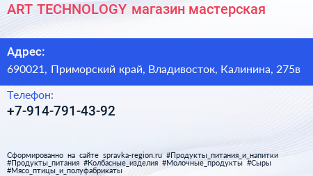 ART TECHNOLOGY, магазин-мастерская по адресу 690021, Приморский край, Владивосток, Калинина, 275в в дальнейшем Организация, размещена в следующих категориях: