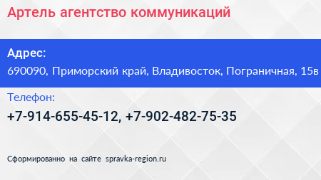 Артель, агентство коммуникаций по адресу 690090, Приморский край, Владивосток, Пограничная, 15в в дальнейшем Организация, размещена в следующих категориях: