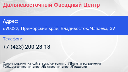 Дальневосточный Фасадный Центр по адресу 690022, Приморский край, Владивосток, Чапаева, 39 в дальнейшем Организация, размещена в следующих категориях: