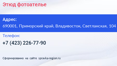 Этюд, фотоателье по адресу 690001, Приморский край, Владивосток, Светланская, 104 в дальнейшем Организация, размещена в следующих категориях:
