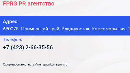 FPRG, PR-агентство по адресу 690078, Приморский край, Владивосток, Комсомольская, 1 в дальнейшем Организация, размещена в следующих категориях:
