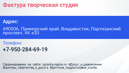 Фактура, творческая студия по адресу 690106, Приморский край, Владивосток, Партизанский проспект, 44 к10 в дальнейшем Организация, размещена в следующих категориях: