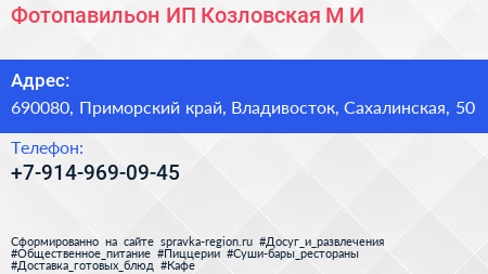 Фотопавильон, ИП Козловская М.И. по адресу 690080, Приморский край, Владивосток, Сахалинская, 50 в дальнейшем Организация, размещена в следующих категориях: