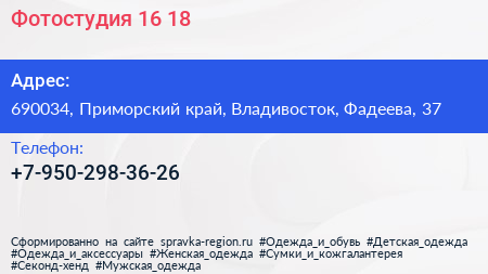 Фотостудия 16.18 по адресу 690034, Приморский край, Владивосток, Фадеева, 37 в дальнейшем Организация, размещена в следующих категориях: