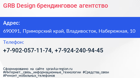 GRB Design, брендинговое агентство по адресу 690091, Приморский край, Владивосток, Набережная, 10 в дальнейшем Организация, размещена в следующих категориях: