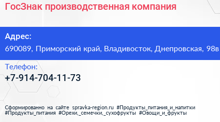 ГосЗнак, производственная компания по адресу 690089, Приморский край, Владивосток, Днепровская, 98в в дальнейшем Организация, размещена в следующих категориях:
