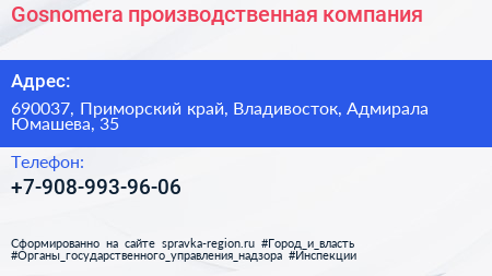 Gosnomera, производственная компания по адресу 690037, Приморский край, Владивосток, Адмирала Юмашева, 35 в дальнейшем Организация, размещена в следующих категориях: