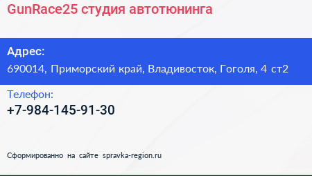 GunRace25, студия автотюнинга по адресу 690014, Приморский край, Владивосток, Гоголя, 4 ст2 в дальнейшем Организация, размещена в следующих категориях: