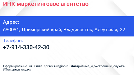 ИНК, маркетинговое агентство по адресу 690091, Приморский край, Владивосток, Алеутская, 22 в дальнейшем Организация, размещена в следующих категориях: