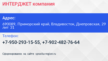 ИНТЕРДЖЕТ, компания по адресу 690089, Приморский край, Владивосток, Днепровская, 29 лит 31 в дальнейшем Организация, размещена в следующих категориях: