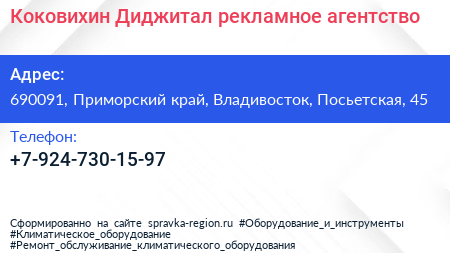 Коковихин Диджитал, рекламное агентство по адресу 690091, Приморский край, Владивосток, Посьетская, 45 в дальнейшем Организация, размещена в следующих категориях:
