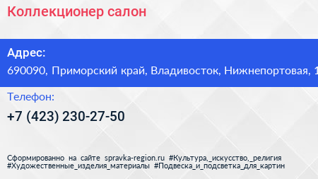 Коллекционер, салон по адресу 690090, Приморский край, Владивосток, Нижнепортовая, 1 в дальнейшем Организация, размещена в следующих категориях: