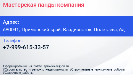 Мастерская панды, компания по адресу 690041, Приморский край, Владивосток, Полетаева, 6д в дальнейшем Организация, размещена в следующих категориях: