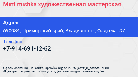Mint mishka, художественная мастерская по адресу 690034, Приморский край, Владивосток, Фадеева, 37 в дальнейшем Организация, размещена в следующих категориях: