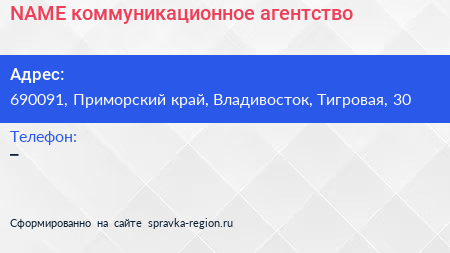 NAME, коммуникационное агентство по адресу 690091, Приморский край, Владивосток, Тигровая, 30 в дальнейшем Организация, размещена в следующих категориях: