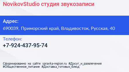 NovikovStudio, студия звукозаписи по адресу 690039, Приморский край, Владивосток, Русская, 40 в дальнейшем Организация, размещена в следующих категориях: