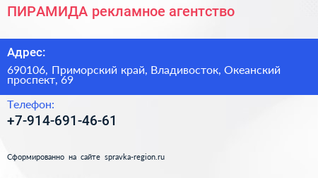 ПИРАМИДА, рекламное агентство по адресу 690106, Приморский край, Владивосток, Океанский проспект, 69 в дальнейшем Организация, размещена в следующих категориях: