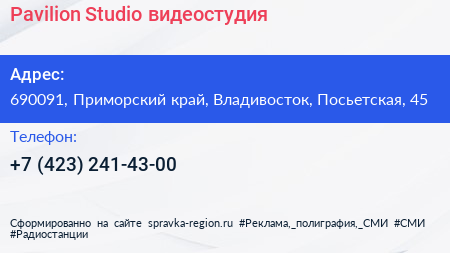 Pavilion Studio, видеостудия по адресу 690091, Приморский край, Владивосток, Посьетская, 45 в дальнейшем Организация, размещена в следующих категориях: