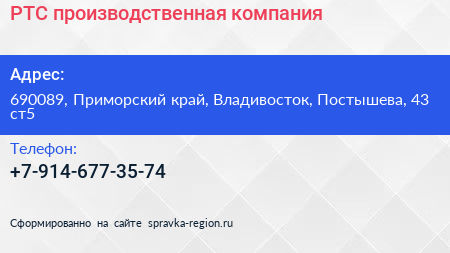 РТС, производственная компания по адресу 690089, Приморский край, Владивосток, Постышева, 43 ст5 в дальнейшем Организация, размещена в следующих категориях: