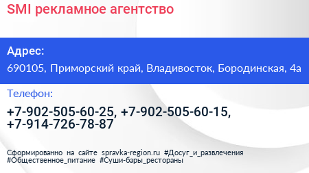 SMI, рекламное агентство по адресу 690105, Приморский край, Владивосток, Бородинская, 4а в дальнейшем Организация, размещена в следующих категориях: